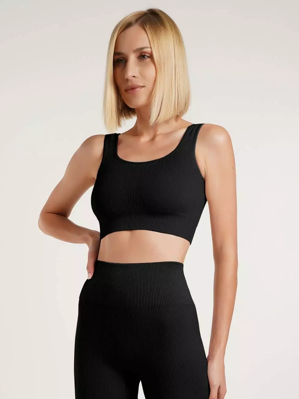 Жіночий безшовний топ у рубчик — універсальна модель для спорту та повсякденного гардероба. М’яка зносостійка мікрофібра забезпечує комфорт, еластичність і свободу рухів. Широкі бретелі гарантують надійну підтримку грудей. Ідеально підходить як базовий топ, білизна або спортивний одяг для тренувань і активного відпочинку.
