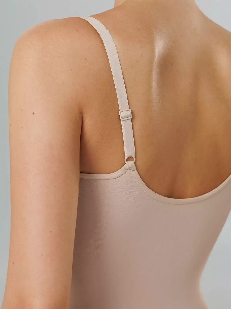 Коригуюче боді із мікрофібри з трусиками-стрінгами на кнопках та регульованими бретелями.