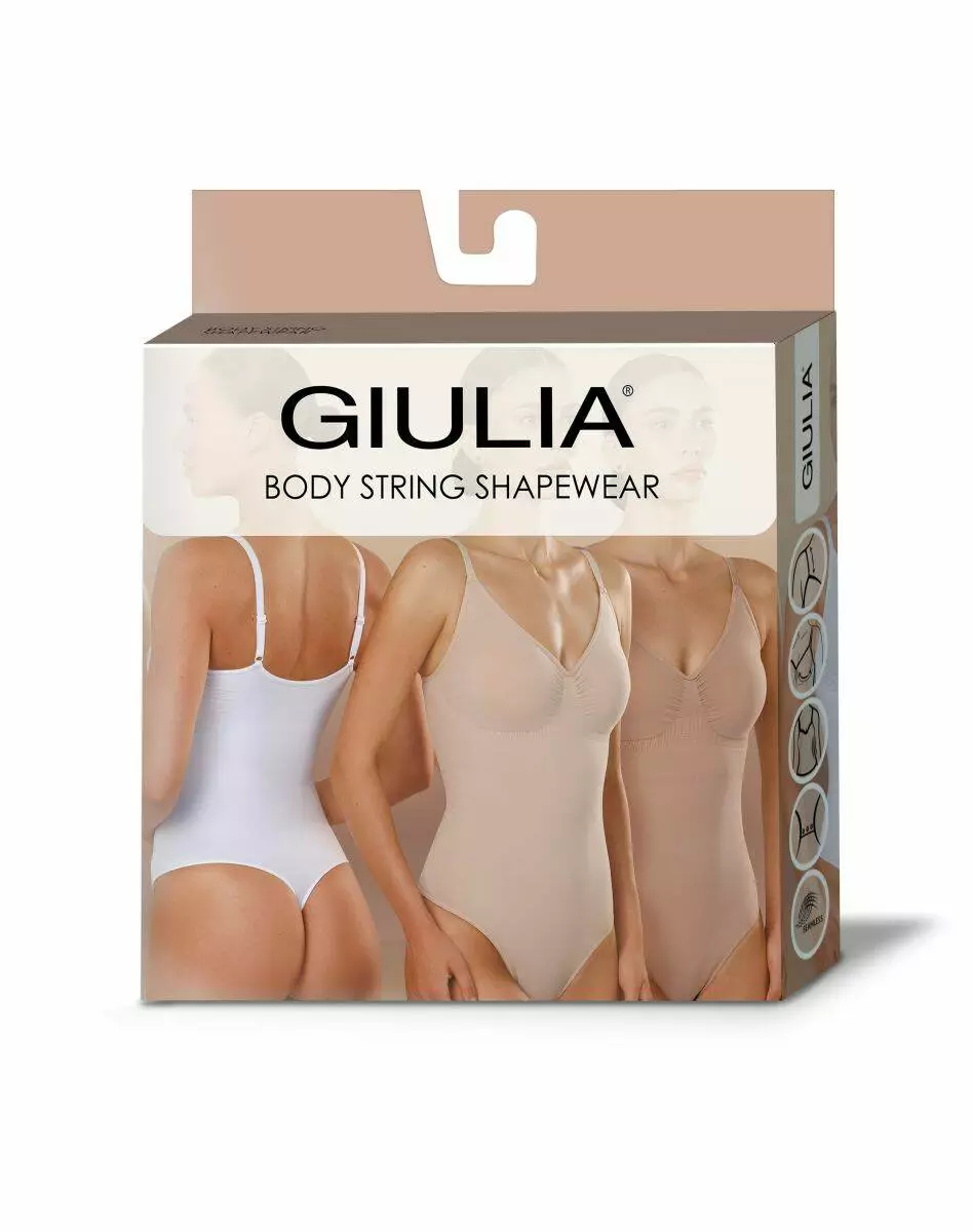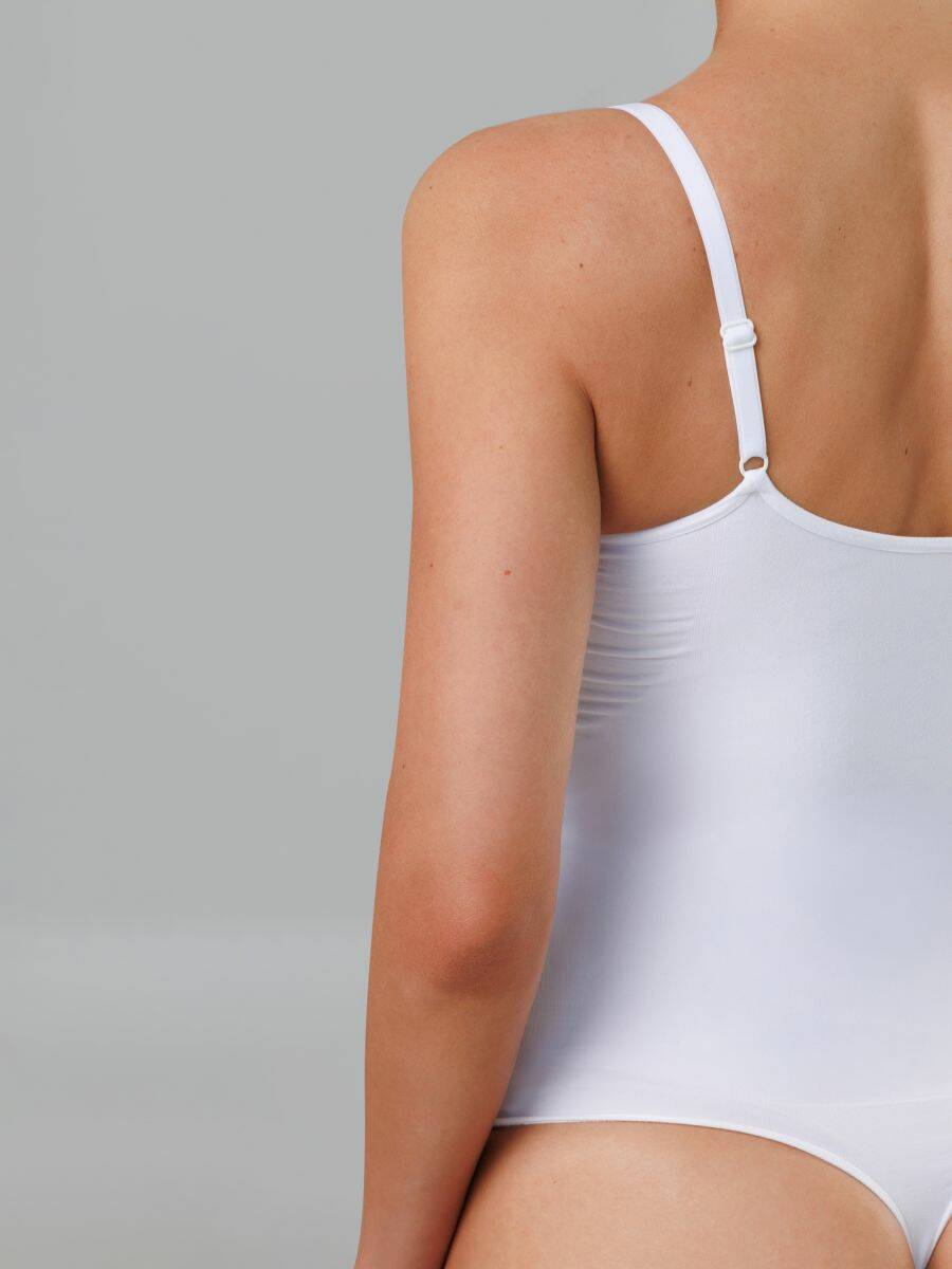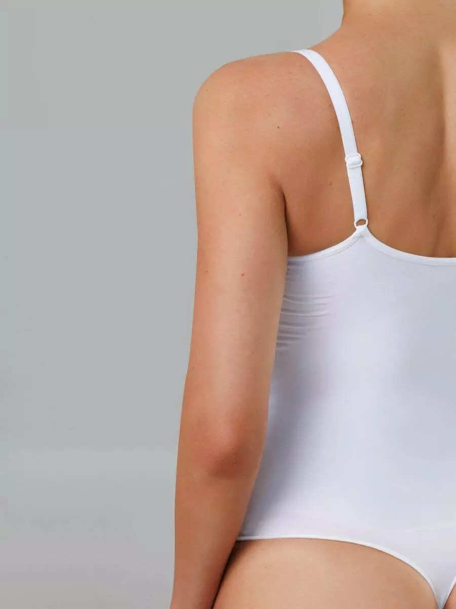 Коригуюче боді із мікрофібри з трусиками-стрінгами на кнопках та регульованими бретелями.