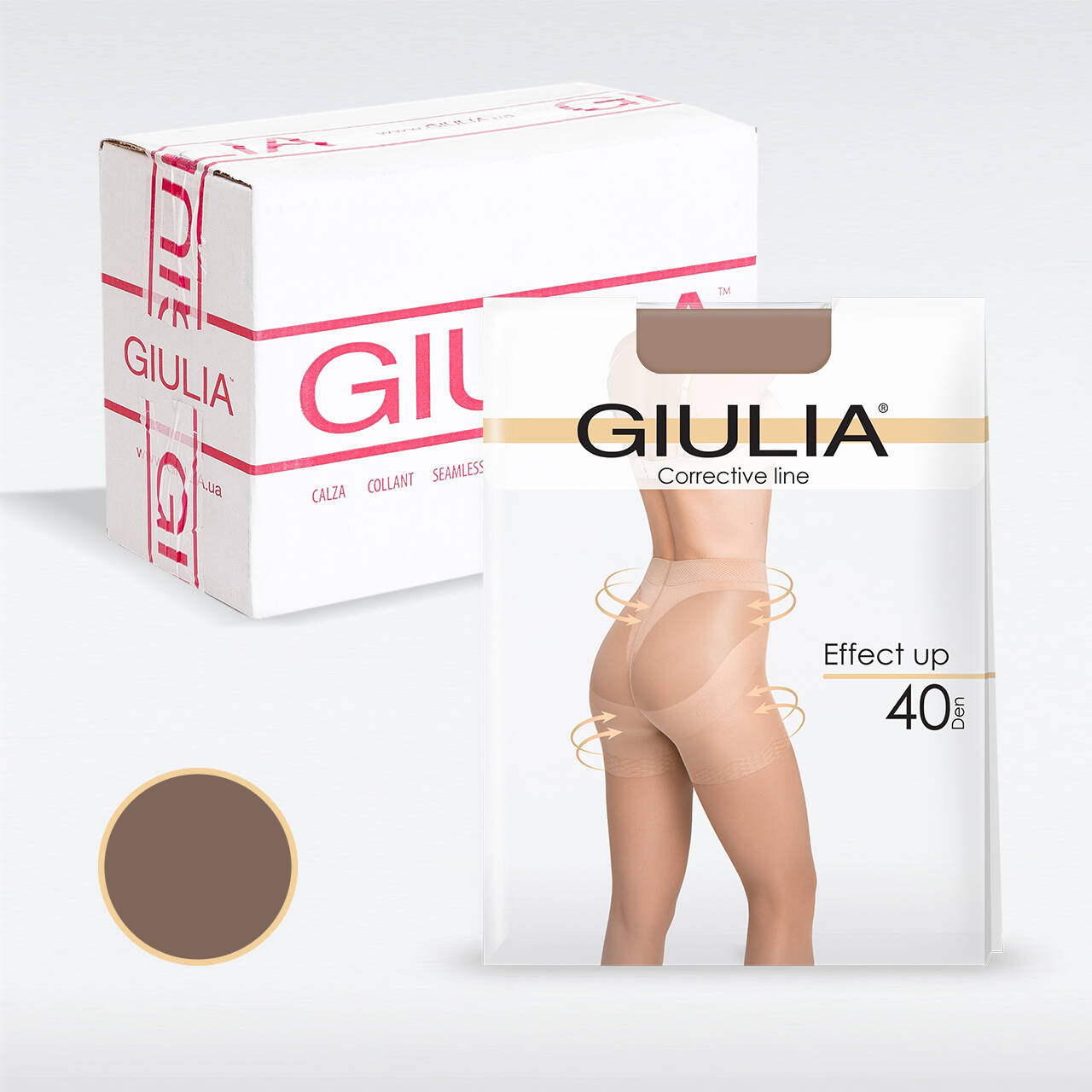 Коригуючі жіночі колготки Giulia EFFECT UP 40 оснащені спеціальними моделюючими високими шортиками, які ефективно формують красиву форму сідниць і піднімають їх. Вони також моделюють стегна, животик і боки, розгладжуючи нерівності завдяки особливо щільним і еластичним зонам у шортиках. Ця прозора модель з напівматовою структурою має щільність 40 den тому чудово облягає ніжки, створюючи рівну і гладку поверхню. Крім того, колготки надзвичайно зручні і практичні завдяки комфортним плоским швам та зручному поясу.
