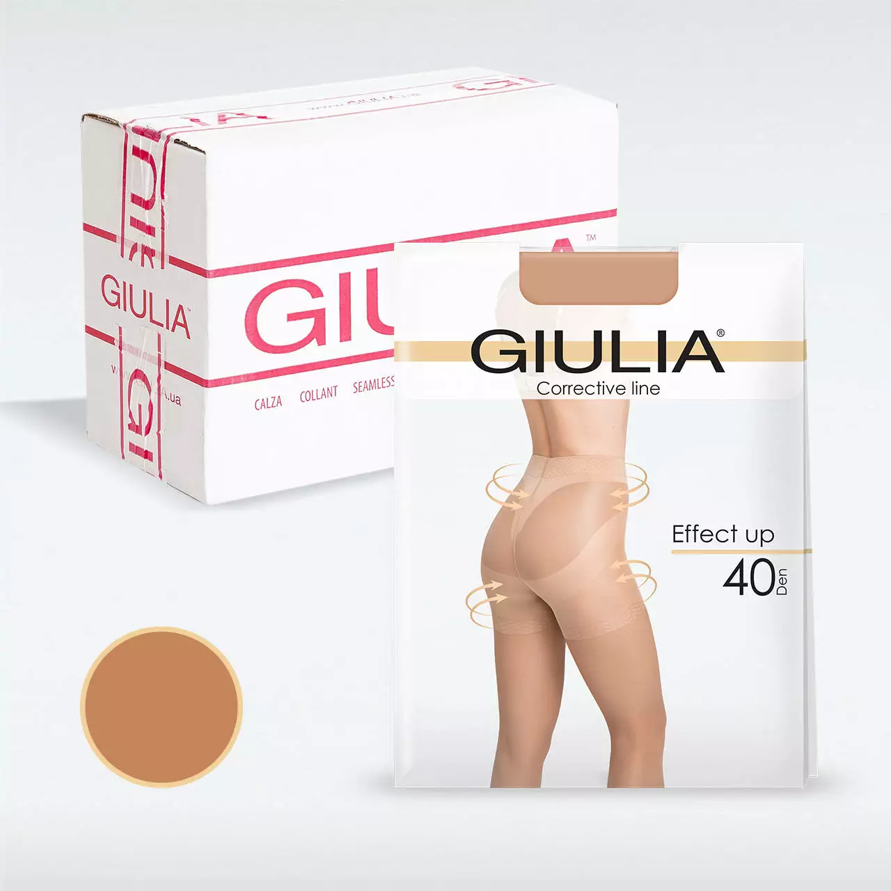 Коригуючі жіночі колготки Giulia EFFECT UP 40 оснащені спеціальними моделюючими високими шортиками, які ефективно формують красиву форму сідниць і піднімають їх. Вони також моделюють стегна, животик і боки, розгладжуючи нерівності завдяки особливо щільним і еластичним зонам у шортиках. Ця прозора модель з напівматовою структурою має щільність 40 den тому чудово облягає ніжки, створюючи рівну і гладку поверхню. Крім того, колготки надзвичайно зручні і практичні завдяки комфортним плоским швам та зручному поясу.