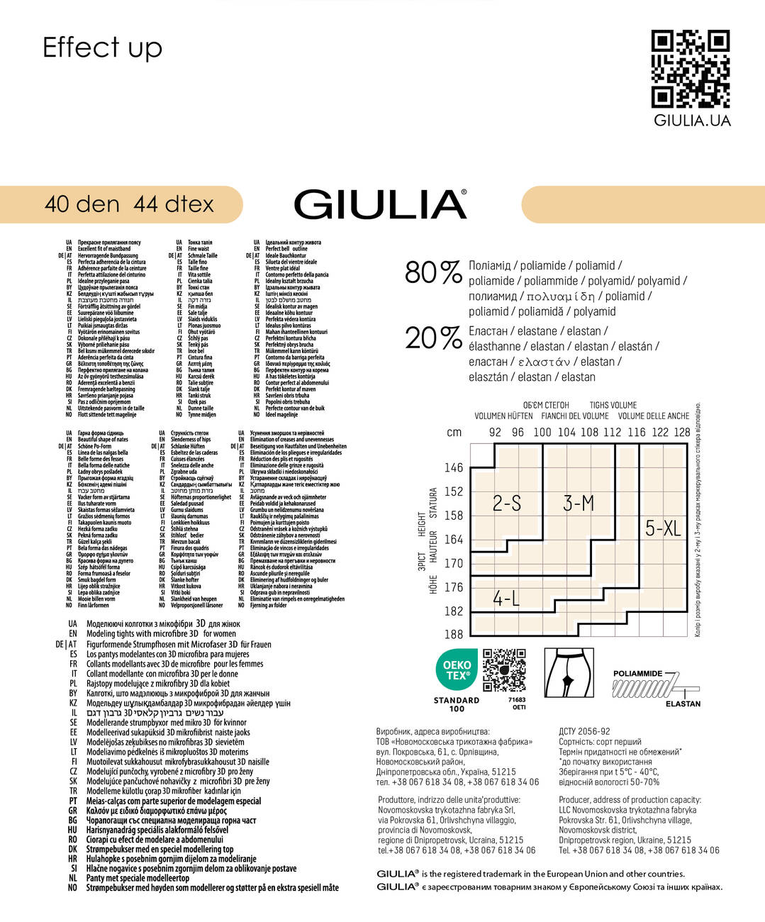 Коригуючі жіночі колготки Giulia EFFECT UP 40 оснащені спеціальними моделюючими високими шортиками, які ефективно формують красиву форму сідниць і піднімають їх. Вони також моделюють стегна, животик і боки, розгладжуючи нерівності завдяки особливо щільним і еластичним зонам у шортиках. Ця прозора модель з напівматовою структурою має щільність 40 den тому чудово облягає ніжки, створюючи рівну і гладку поверхню. Крім того, колготки надзвичайно зручні і практичні завдяки комфортним плоским швам та зручному поясу.