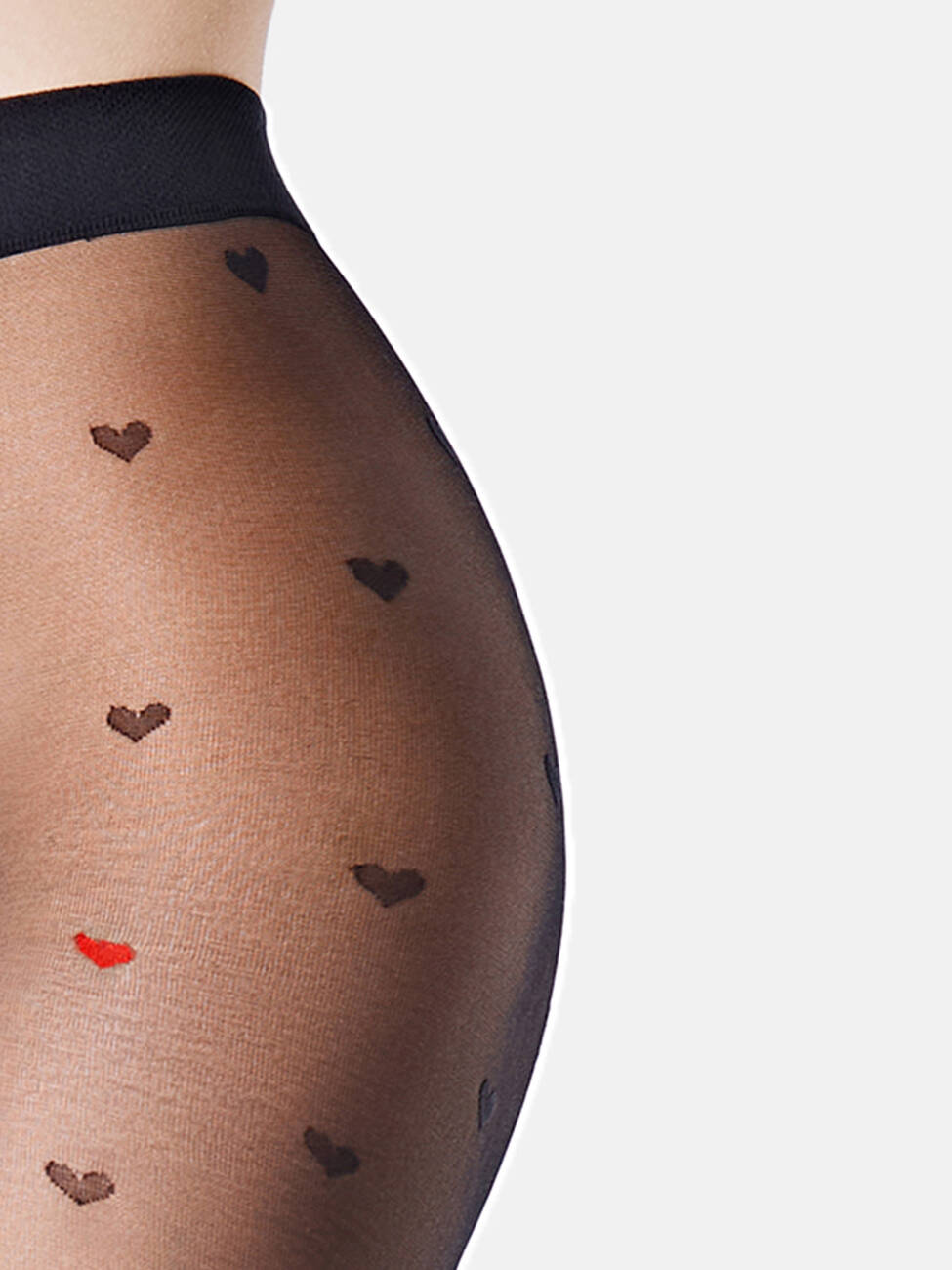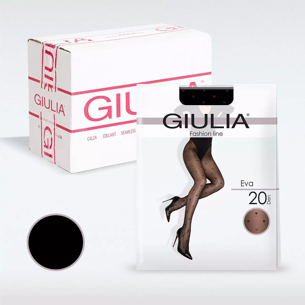 Колготки Giulia EVA 20 вирізняються серед фантазійної лінійки яскравим принтом із маленьких чорних та червоних сердець по всій довжині виробу. Модель має посилений пояс-резинку та середню посадку, щільність 20 den та укріплений мисок. Бавовняна ластовиця гарантує комфорт та гігієну під час носіння..