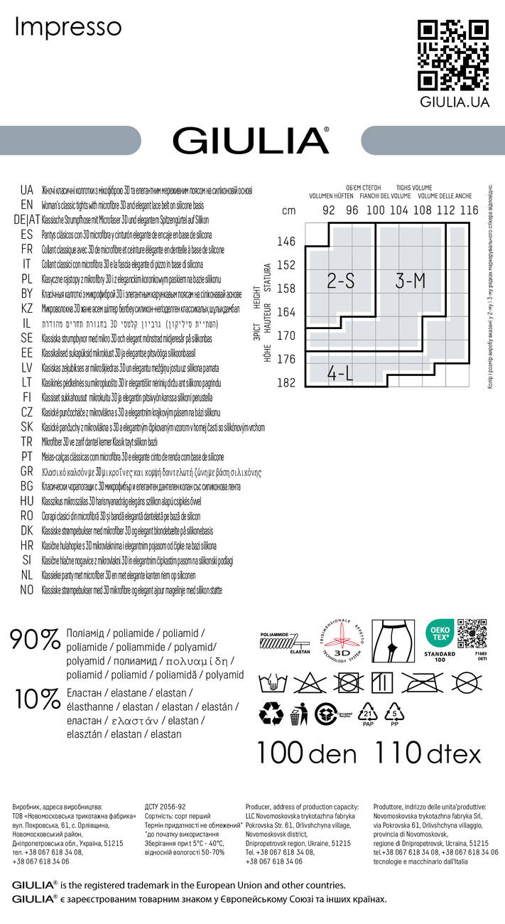 Вишукані теплі колготки Giulia IMPRESSO 100 зроблені з мякої мікрофібри, яка забезпечує неперевершений комфорт і тепло в холодну погоду. Ці зимові колготи оздоблені ажурним поясом з якісною силіконовою основою, що надійно тримається на талії і не сповзає, мають плоскі шви. Матеріал щільністю 100 den є дуже еластичним, що дозволяє вільно рухатися і забезпечує довговічність виробу.