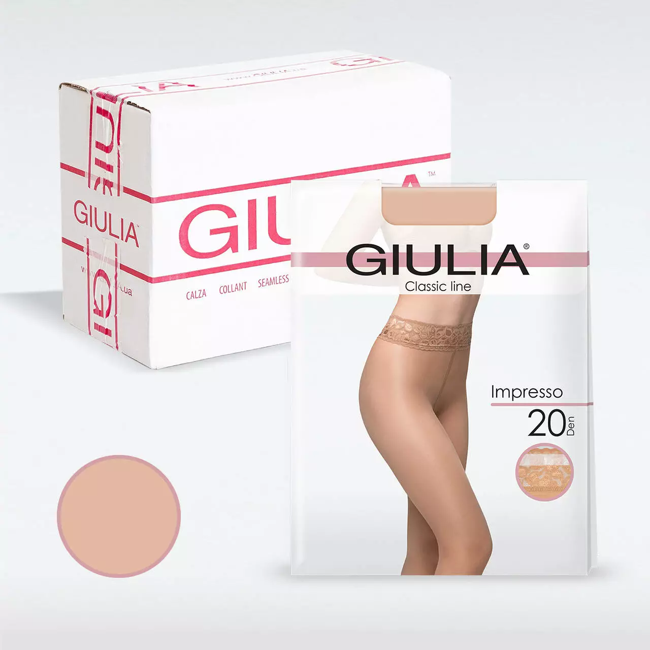 У колготок Giulia IMPRESSO 20 класичний дизайн з унікальною деталлю - витонченим широким поясом з ажурного мережива з романтичним квітковим візерунком на якісній силіконовій основі. Плоскі шви та щільність 20 den роблять цю модель максимально комфортною у щоденній носці. Колготки надійно фіксуються і чудово сидять на стегнах і талії, не врізаються в шкіру, не сповзають і не передавлюють. Висота посадки на талії - середня, а також є гігієнічна ластовиця з бавовни для додаткової гігієни.
