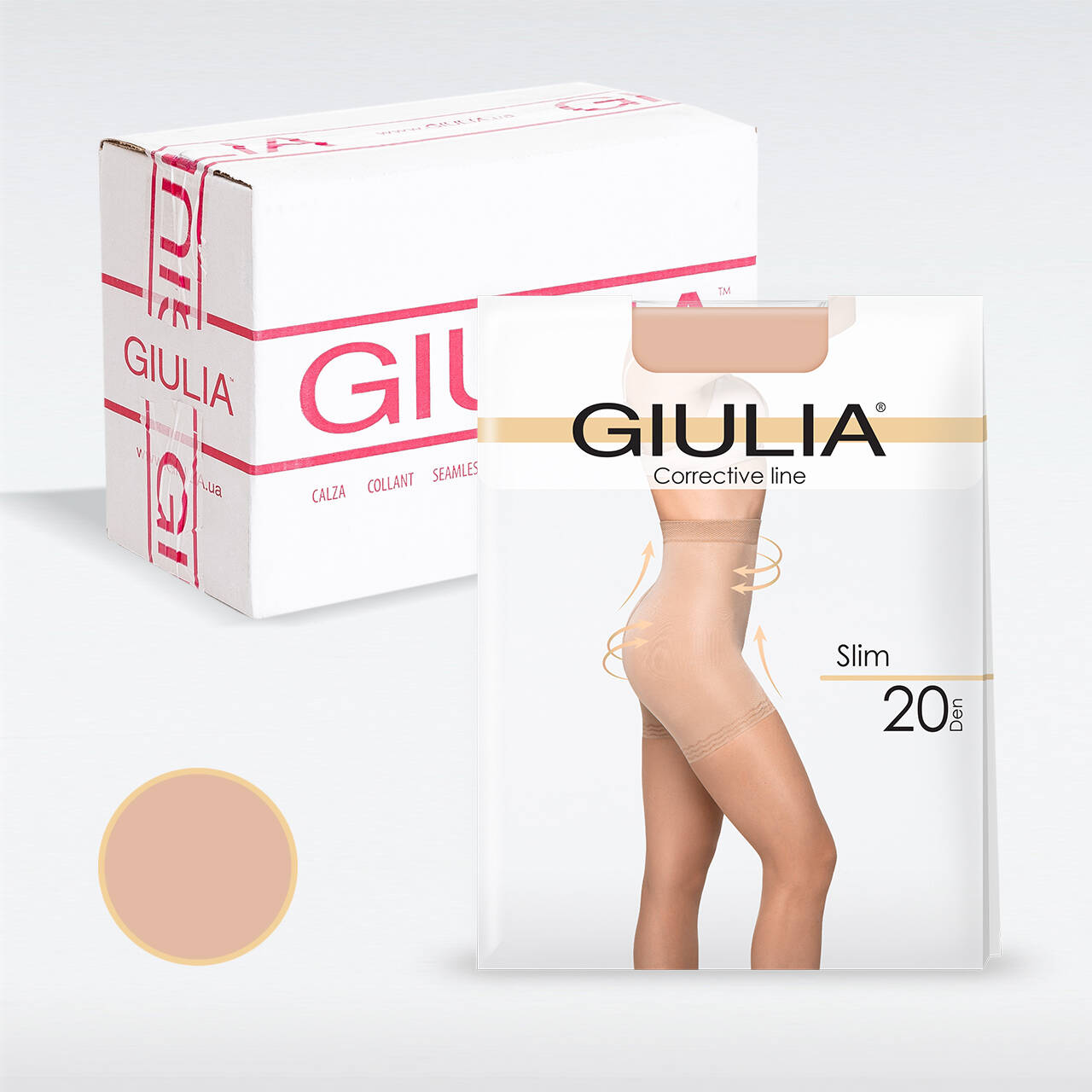 Тонкі жіночі колготки з коригуючими шортиками Giulia SLIM 20 відрізняються змішаною щільністю: основна частина колготок має 20 den, а високі підтягуючі шортики - 150 den. Це забезпечує відмінне підтягування і моделювання фігури в області стегон, сідниць, талії, живота і боків. Модель має гладку, матову і еластичну поверхню. Шортики оснащені міцною, м'якою і широкою еластичною резинкою вгорі, що забезпечує комфортне і надійне фіксування. Також присутні комфортні плоскі шви і бавовняна ластовиця для додаткового комфорту і гігієни.