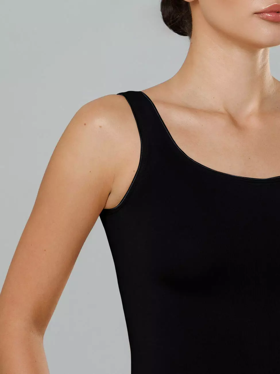 Майка з широкими бретелями із мікрофібри та декоративним кантом.