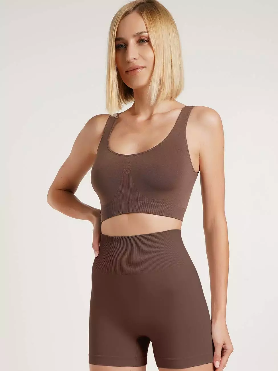 Жіночий короткий топ із широкими бретелями та круглим вирізом Giulia TANK TOP є максимально універсальнім, завдяки своїй розтяжності підходить для будь-якої фігури. А також він може бути як ідеальним елементом спідньої білизни - зручним та комфортним для щоденного носіння, і в той же час він може бути ідеальним вибором для літніх днів і активного відпочинку або навіть занять спортом, як предмет одягу. Виготовлений з м'якої мікрофібри, він швидко вбирає вологу та забезпечує відчуття свіжості, дозволяючи шкірі дихати. Топ має високу еластичність, що дозволяє йому зберігати свою форму і не деформуватися під час розтягування. Широка резинка внизу ефективно тримає топ на місці, не залишаючи слідів на шкірі і не спричиняючи дискомфорту, а анатомічна конструкція забезпечує гарну посадку на груди. При правильному догляді цей топ буде довго радувати своїм привабливим виглядом.