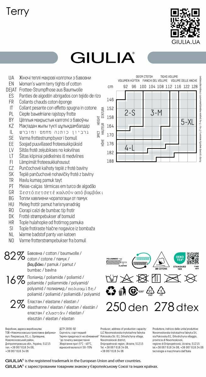 Завдяки унікальним терморегулюючим властивостям бавовни та щільності 250 den, зимові колготки Giulia TERRY 250 чудово захищають ноги від холоду і вітру, забезпечуючи тривале відчуття комфорту та затишку завдяки м'якій внутрішній поверхні. Середня посадка, плоскі шви і комфортний еластичний пояс не перетискають талію, що додає додаткової зручності. Ці махрові колготки з начосом ідеально підходять для повсякденного носіння зі спідницями та сукнями, а також можуть бути використані в морозну погоду під штани або джинси, забезпечуючи тепло і комфорт у будь-якій ситуації.