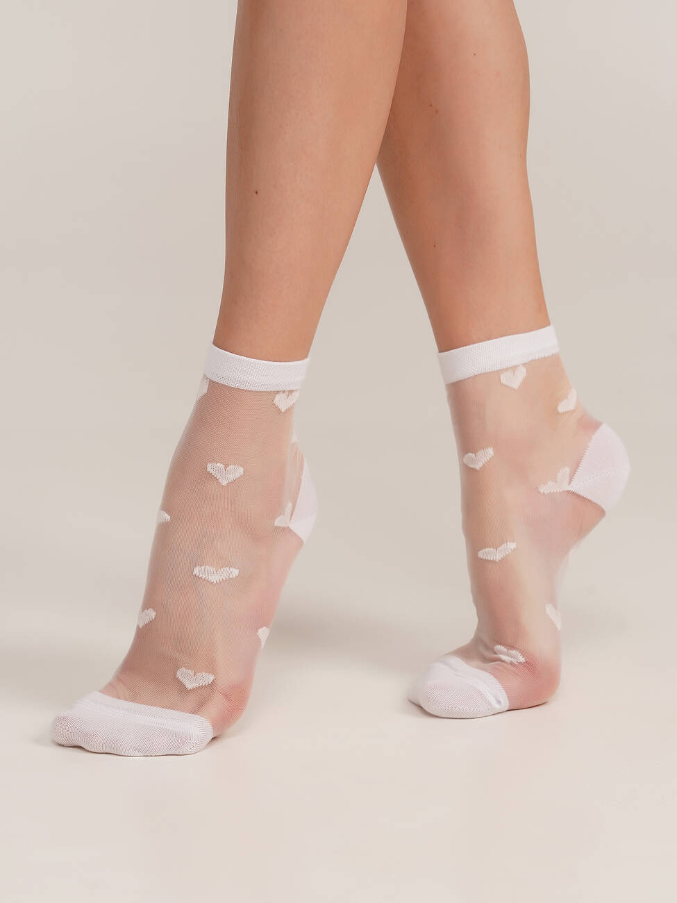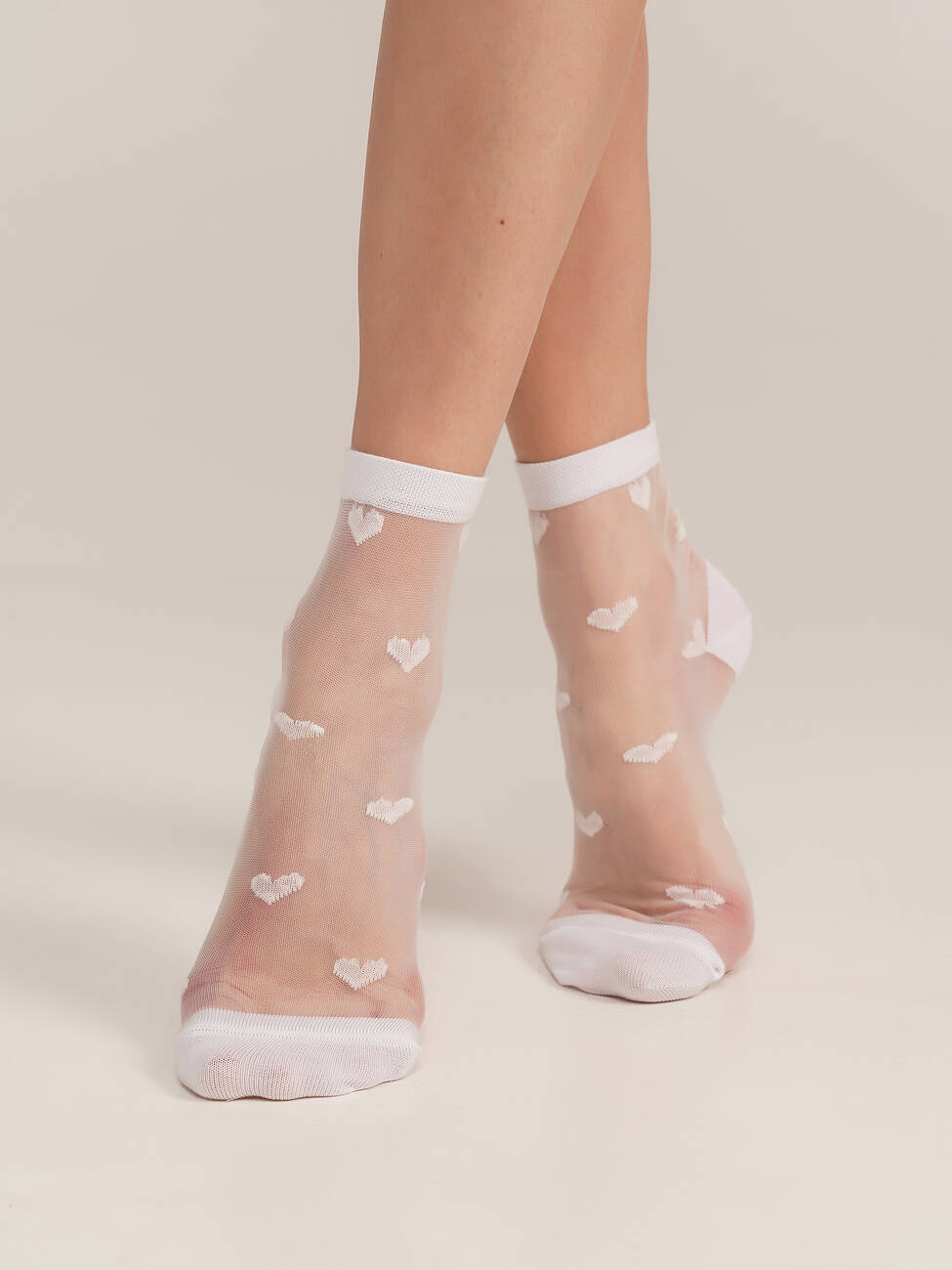 Ніжні жіночі шкарпетки WS2 CRISTAL 074 білого кольору з витонченим візерунком у вигляді білих сердечок. Виконані з тонкої напівпрозорої тканини. Ідеально підійдуть для створення легкого та романтичного образу.
